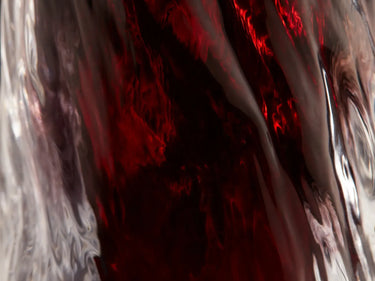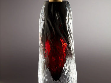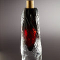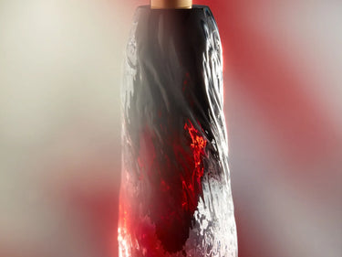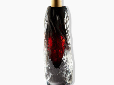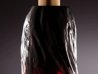 The garnet-toned, handcrafted Bohemian bottle gleams in the light and delivers striking artistry, serving as a centerpiece for those who appreciate design and powerful woody accents.