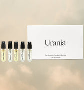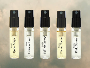 The Urania Discovery Set brings together five gender-neutral creations in 2ml vials—Queer Magic, Fluid Nature, Divine Nectar, Lance of Love, and Self‑Mythology.