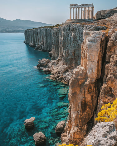 You stand on the cliffs of Skyros, where the sea whispers tales of heroes and the sun gilds the earth in golden light.