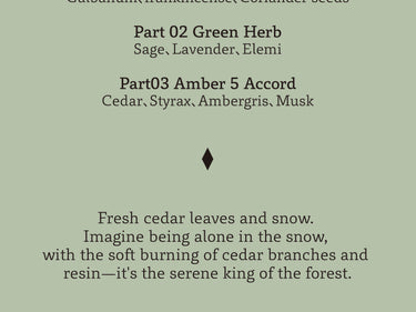 The heart gives way to an amber accord—warm, honeyed resin wrapped with cedar, styrax, ambergris, and musk—until the base becomes a pale, crystalline immensity of fresh cedar leaves and snow.