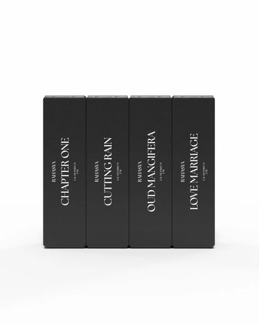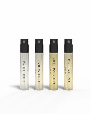 Perfect for self exploration or as a tasteful mini gift, the Sampler Set features 4 x 2 ml vials of the debut collection: Chapter One, Cutting Rain, Oud Mangifera, and Love Marriage.